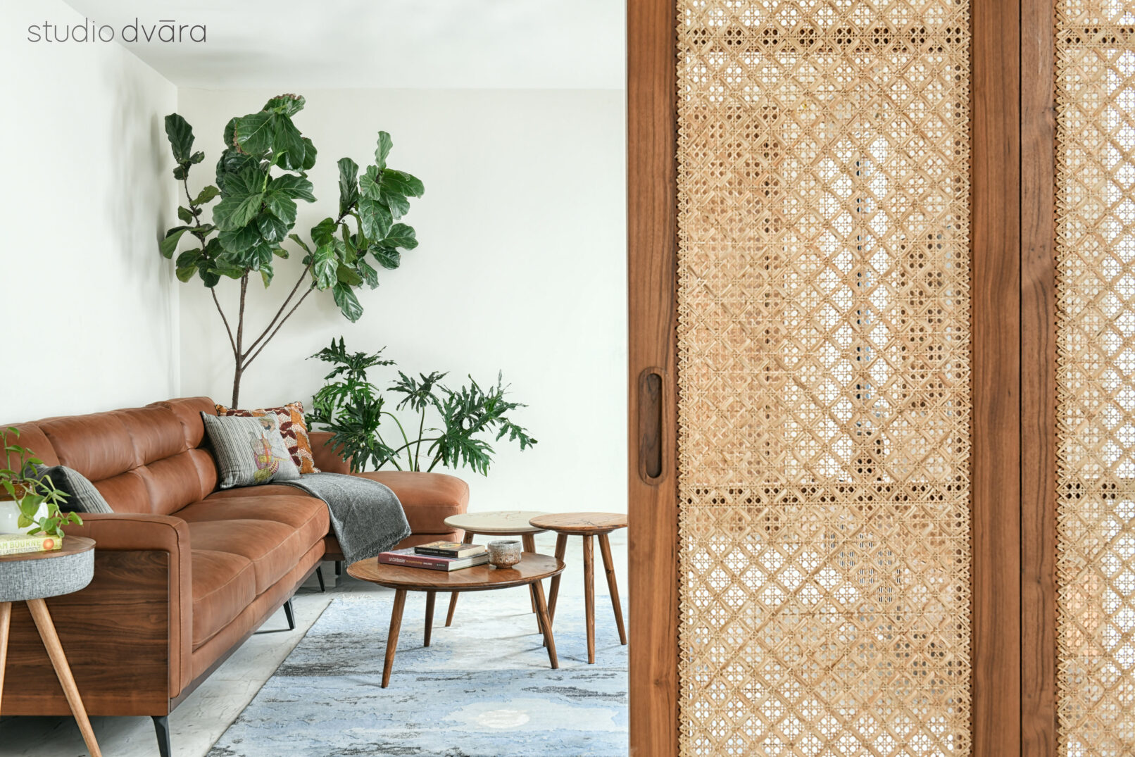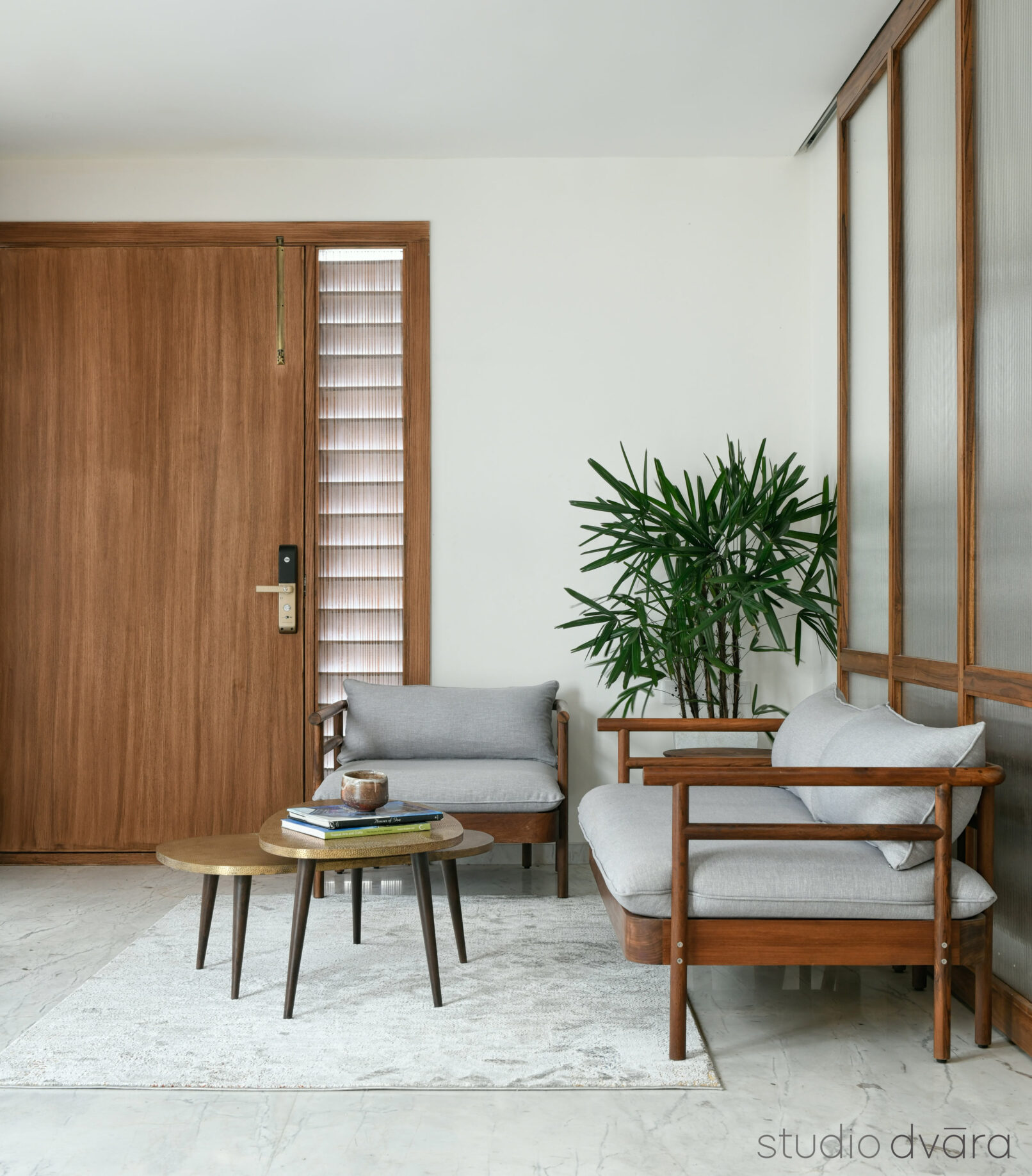 The plain white walls create a reflective atmosphere, complementing natural textures, wooden furniture, Sqt furnishing fabrics, and indoor plants. The terrace boasts a unique pergola with perforated concrete blocks, playing with light and shadow.