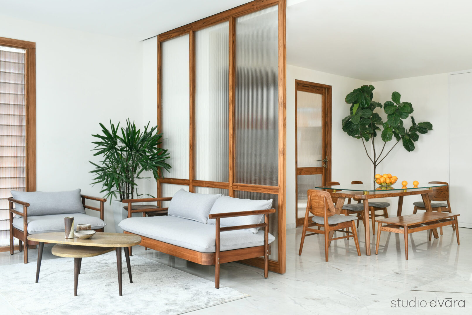 This 4450 sqft villa, situated in a bustling gated community, features minimal intervention with maximum impact. The airy drawing room showcases exemplary craftsmanship in select furniture pieces, while a sliding partition in fluted glass separates the drawing and dining rooms.